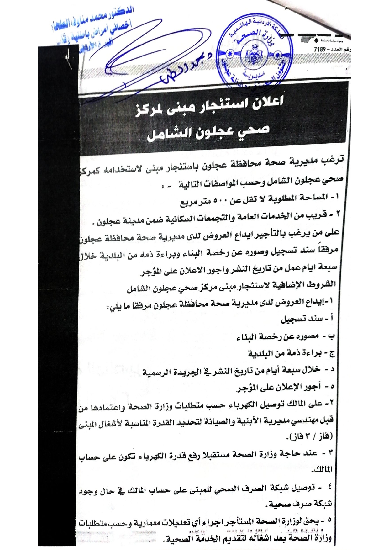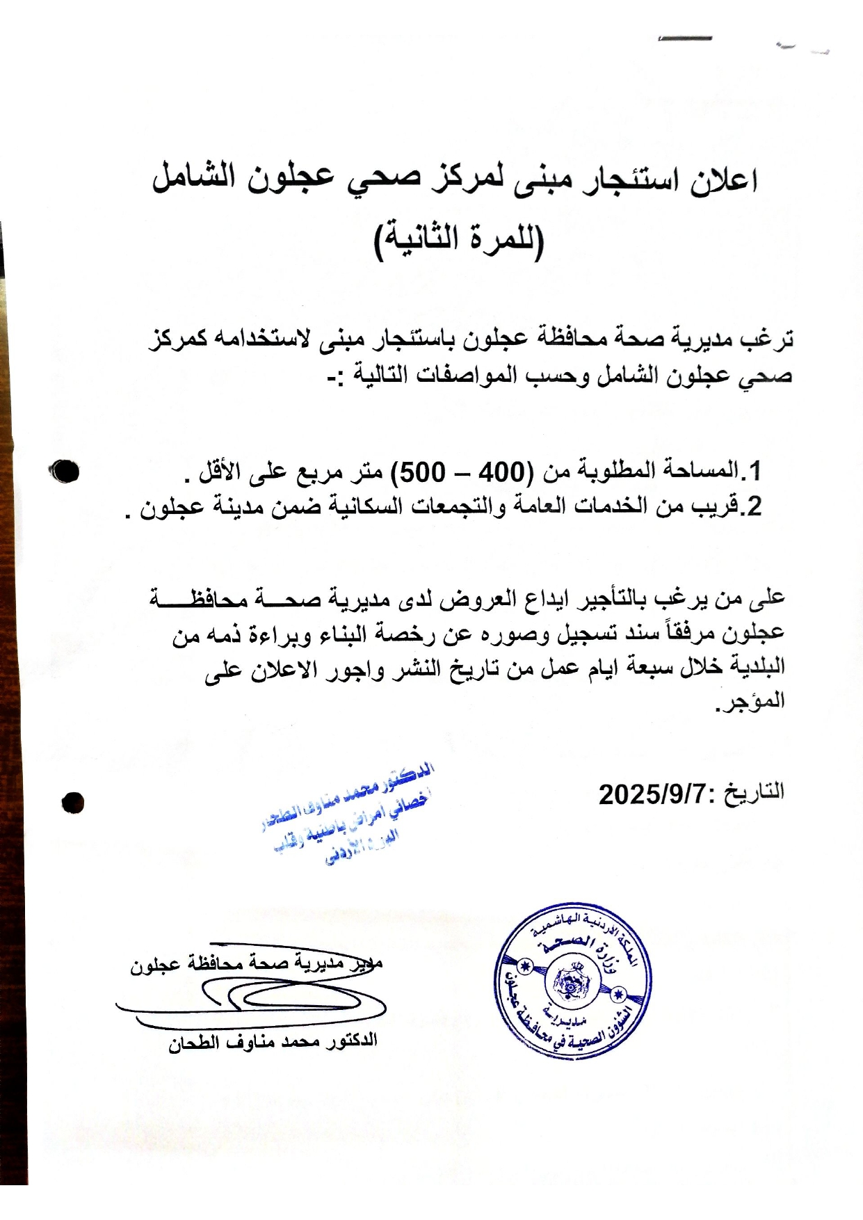 إعلان استئجار مبنى لمركز صحي عجلون الشامل ( للمرة الثانية )أخبار عجلونية آخر تحديث سبتمبر 7, 2025 =المصدر// فريد فريحات – مديرية صحة عجلون أكمل القراءة شارك
