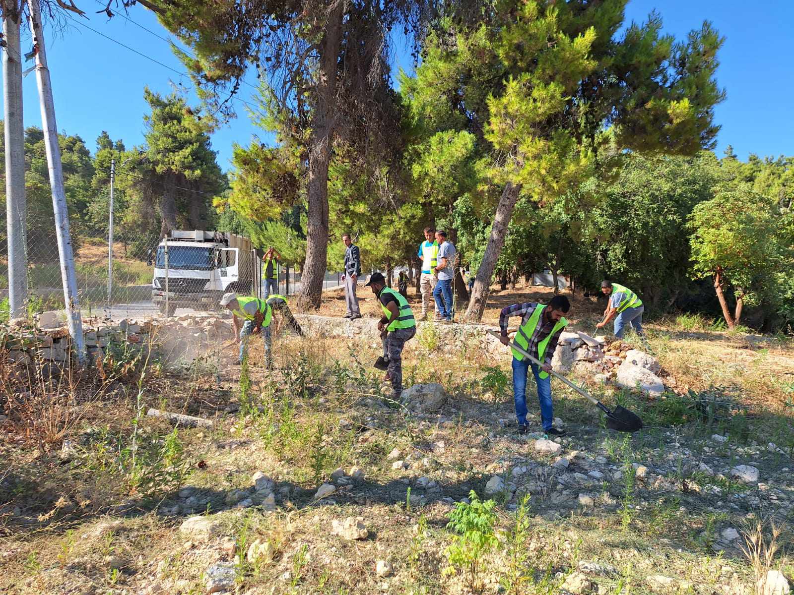 من اخر قام فريق من عمال الوطن التابعين لمجلس الخدمات المشتركة وباشراف خلدون المومني بعملية تعشيب وتنظيف المساحات النباتات والاعشاب الجافة الضارة في الارض المحيطة بمقر اللجنة تحسبا من نشوب حرائق وجمعة وإعادة تأهيل محيط الغراس المزروعة ونكشها وسقايتها إلى جانب قيام فريق اخر بعمل تطوعي لجمع النفايات من الموقع .
