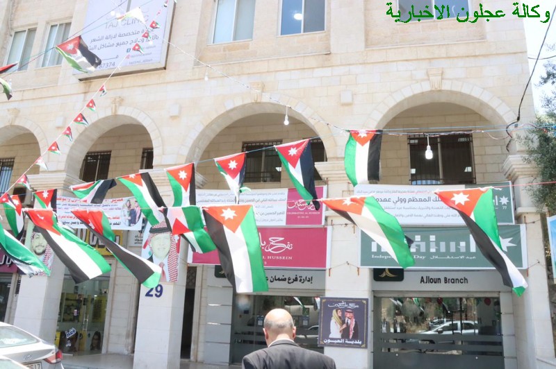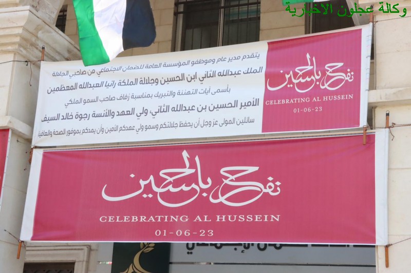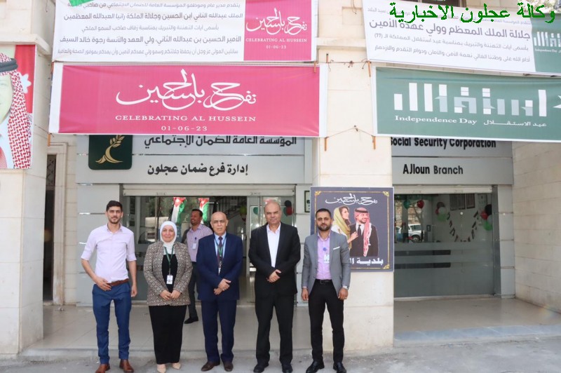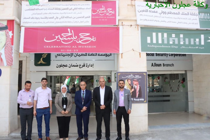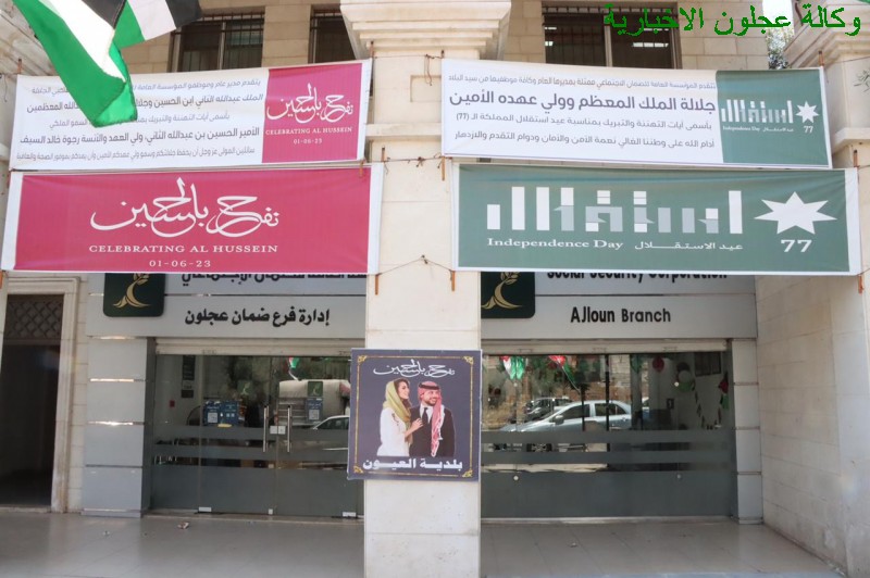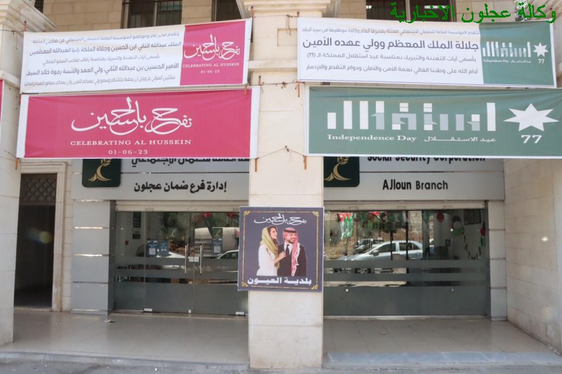 عجلون  الإخبارية : تتواصل استعدادات  مؤسسة الضمان الإجتماعي فرع عجلون للإحتفال  بمناسبة عيد الإستقلال وزواج ولي العد سمو الأمير الحسين بن عبدالله الثاني ، حيث  تم تعليق الصور واليافطات والإعلام  أمام فرع الضمان في عجلون وفي بعض المواقع الأخرى .