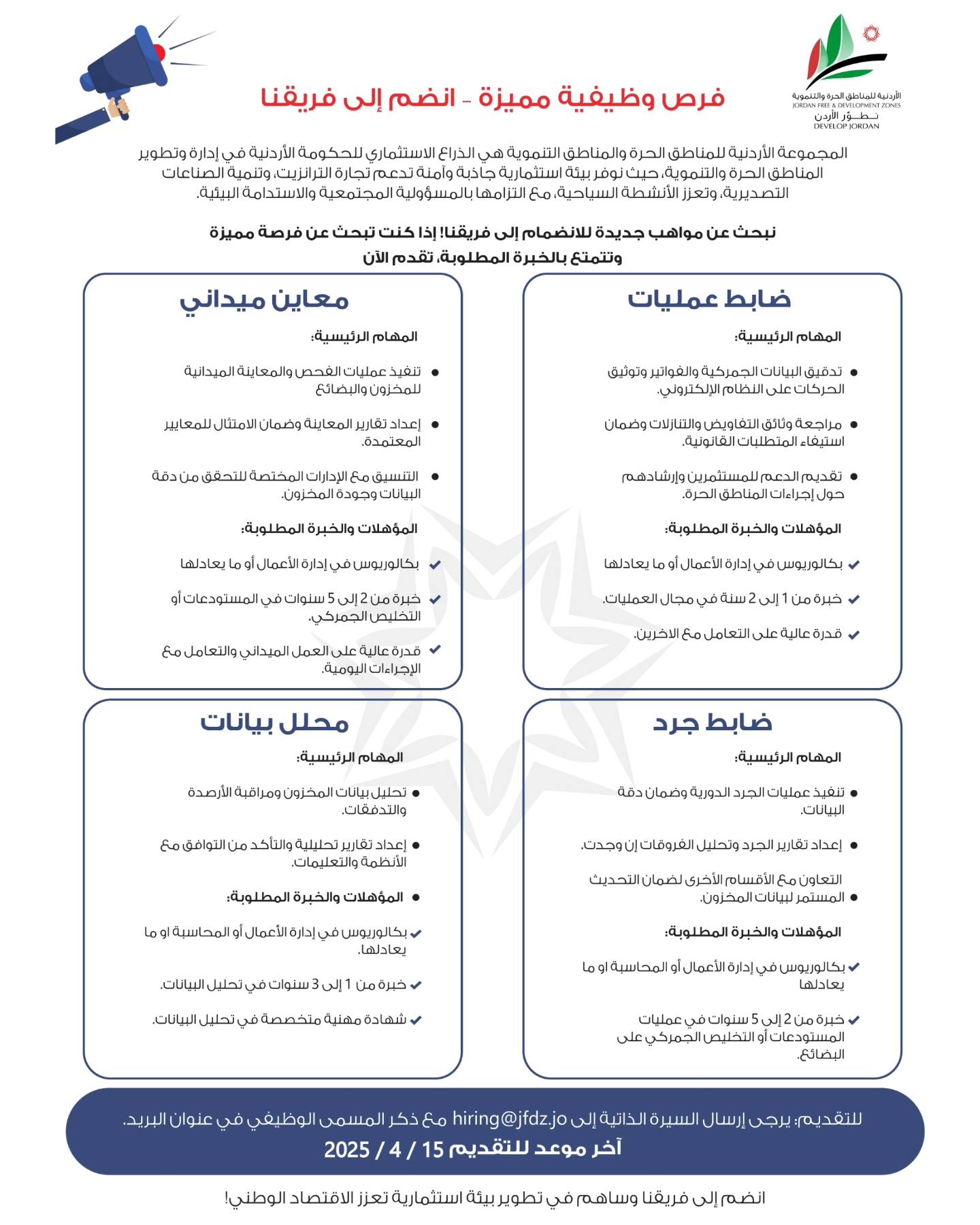أعلنت المجموعة الأردنية للمناطق الحرة والمناطق التنموية عن توفر فرص وظيفية شاغرة ضمن مختلف مجالاتها، في إطار جهودها المستمرة لتعزيز الكفاءات الوطنية وتوفير فرص عمل تساهم في دعم الاقتصاد المحلي.
