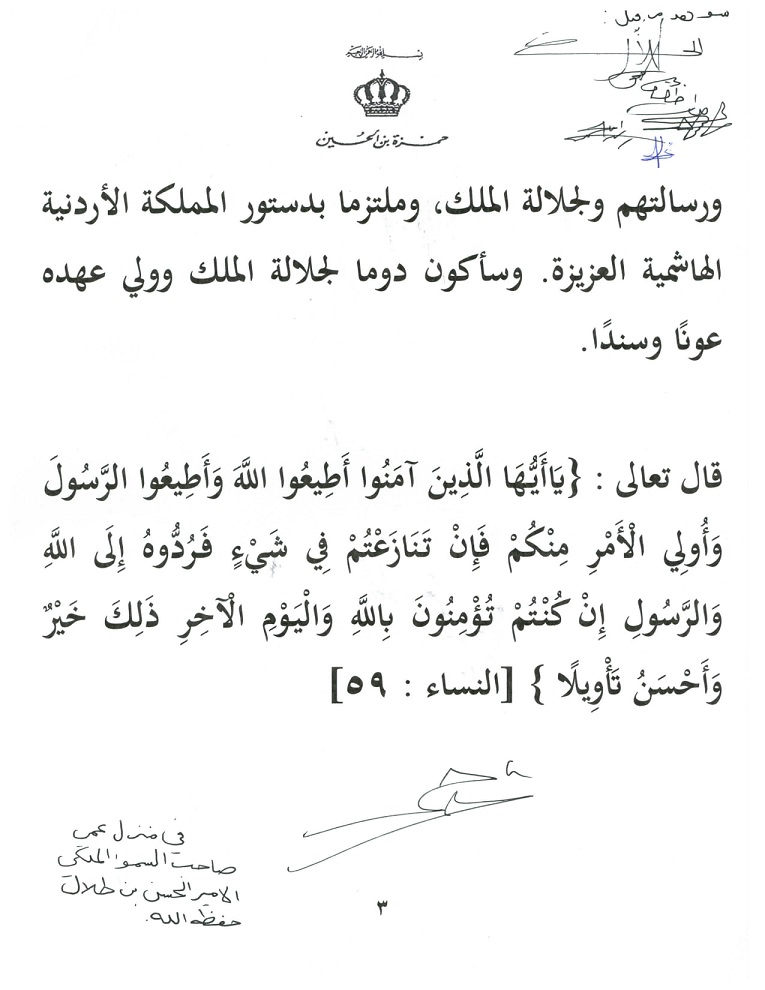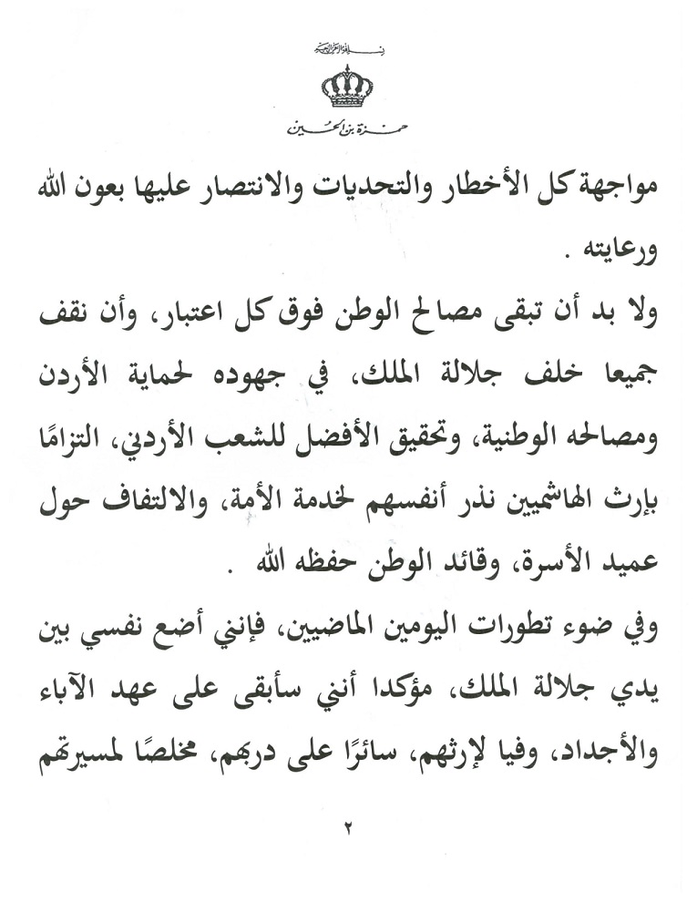 وفي ضوء تطورات اليومين الماضيين، فإنني أضع نفسي بين يدي جلالة الملك، مؤكدا أنني سأبقى على عهد الآباء والأجداد، وفيا لإرثهم، سائرا على دربهم، مخلصا لمسيرتهم ورسالتهم ولجلالة الملك، وملتزما بدستور المملكة الأردنية الهاشمية العزيزة. وسأكون دوما لجلالة الملك وولي عهده عونا وسندا.