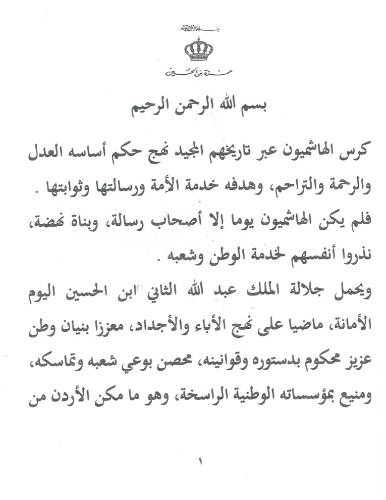 واجتمع الأمير الحسن وأصحاب السمو الأمراء هاشم بن الحسين، وطلال بن محمد، وغازي بن محمد، وراشد بن الحسن، اليوم الاثنين، مع الأمير حمزة في منزل الأمير الحسن، حيث وقع الأمير حمزة رسالة تاليا نصها:”بسم الله الرحمن الرحيمكرس الهاشميون عبر تاريخهم المجيد نهج حكم أساسه العدل والرحمة والتراحم، وهدفه خدمة الأمة ورسالتها وثوابتها. فلم يكن الهاشميون يوما إلا أصحاب رسالة، وبناة نهضة، نذروا أنفسهم لخدمة الوطن وشعبه.