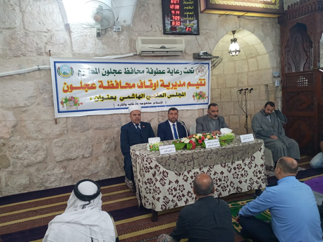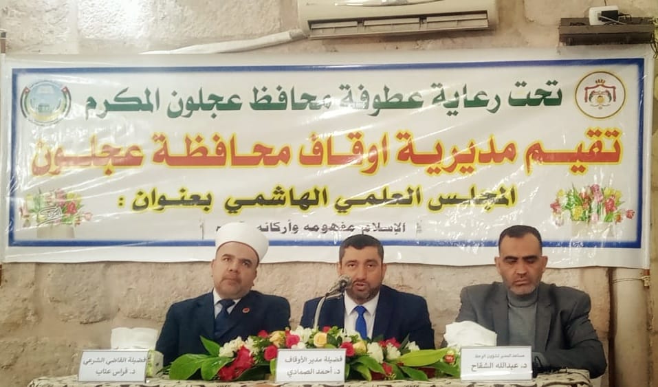 تحت رعاية محافظ محافظة عجلون الدكتور خالد الجبور وبحضور الدكتور أحمد محمود الصمادي مدير مديرية أوقاف محافظة عجلون أقيم المجلس العلمي الهاشمي الأول في مسجد عجلون الكبير اليوم الثلاثاء 2022/4/12. وكان عنوان المجلس ( الإسلام مفهومه و أركانه وآثاره)