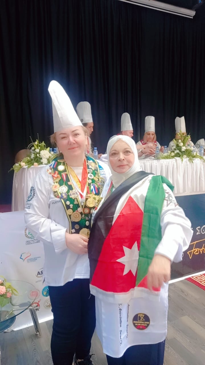 ،والحلويات والمخبوزات العالمية،مشيرة بأن مشاركتها كانت بالموروث الشعبي الأردني مثل أكلة الفناقش السلطية،والمنسف الأردني،واللزاقيات،إضافة للرشوف المبهر ب17 عشر عشبة برية من جبال السلط،واللبن والجميد الأردني،والسمن البلقاوي،وطحين القمح حبة كاملة ،إضافة لأكلة الكعاكيل الشعبية في شمال الأردن.