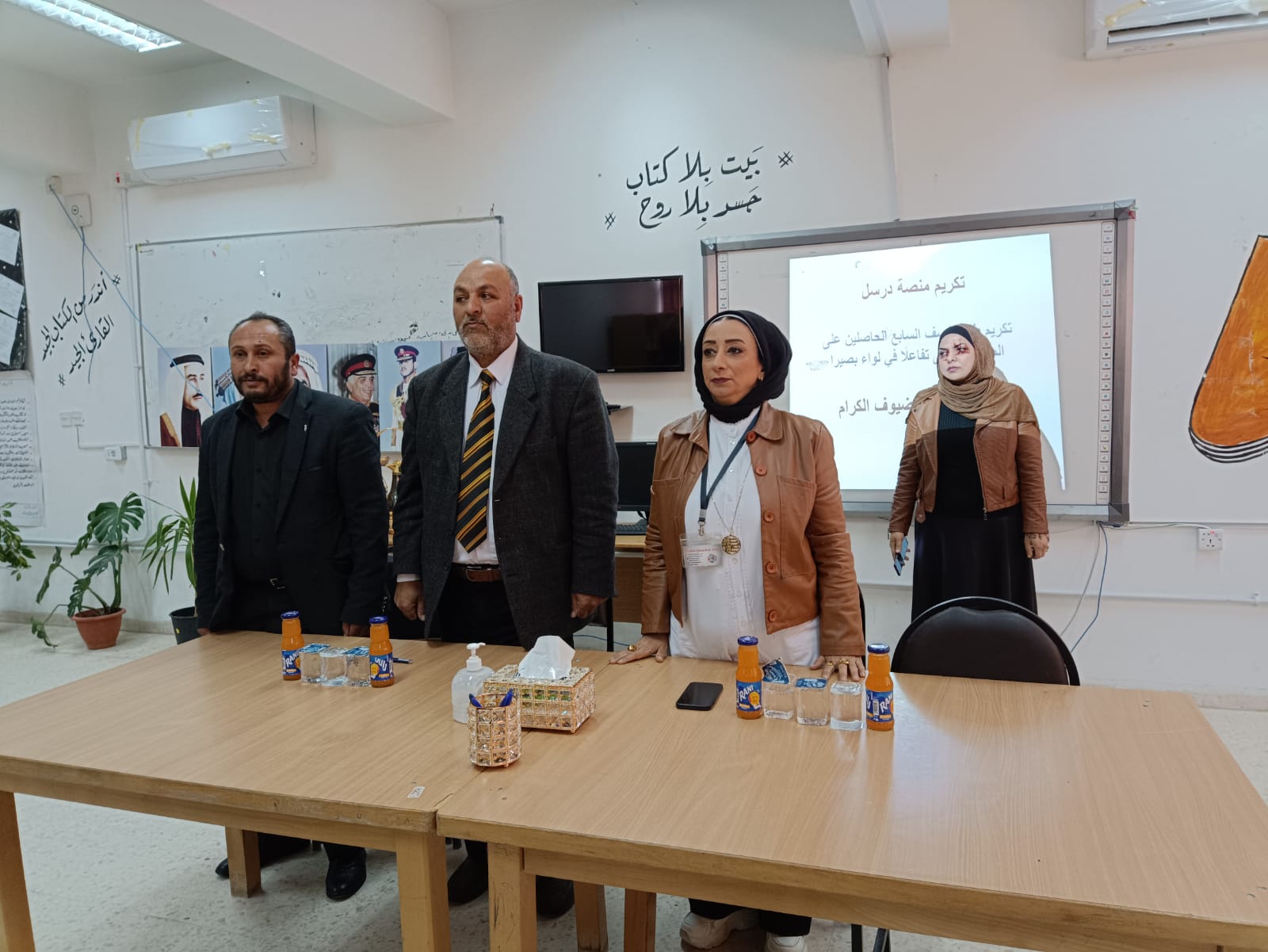 كرم مدير التربية والتعليم للواء بصيرا الدكتور يوسف سليم الفقير عددًا من الطلبة والطالبات ، و مدراء ومديرات المدارس الأكثر تفاعلا مع منصة (درسل ) على مستوى منطقة بصيرا ، وذلك بحضور مدير الشؤون التعليمية الدكتورة فدوى القطاطشة ، ورئيس قسم الإشراف التربوي الأستاذ محمد الرفوع ، ومشرفة الرياضيات الفاضلة شيرين عيال عواد في مدرسة القادسية الثانوية للبنات ؛ وذلك للجهود المتميزة والمتابعة المستمرة ضمن منصة درسل التعليمية .