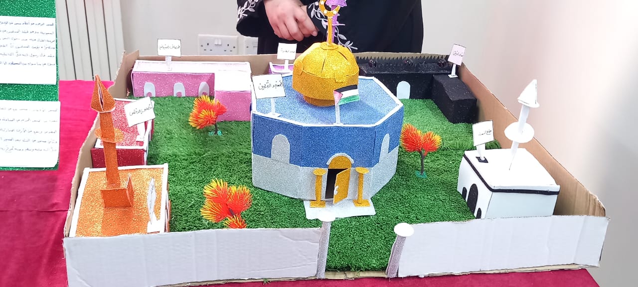وتضمن المعرض مجسمات للمسجد الأقصى والكعبة المشرفة والعديد من الفقرات الثقافية بالإضافة إلى وسائل عرض تعريفية وإرشادية توضح آداب وتعاليم متعددة وأحكام التجويد القرآنية حيث استمع الشرع لشرح مفصل من الطالبات المشاركات في المعرض مبديا إعجابه بالتنظيم والعرض.