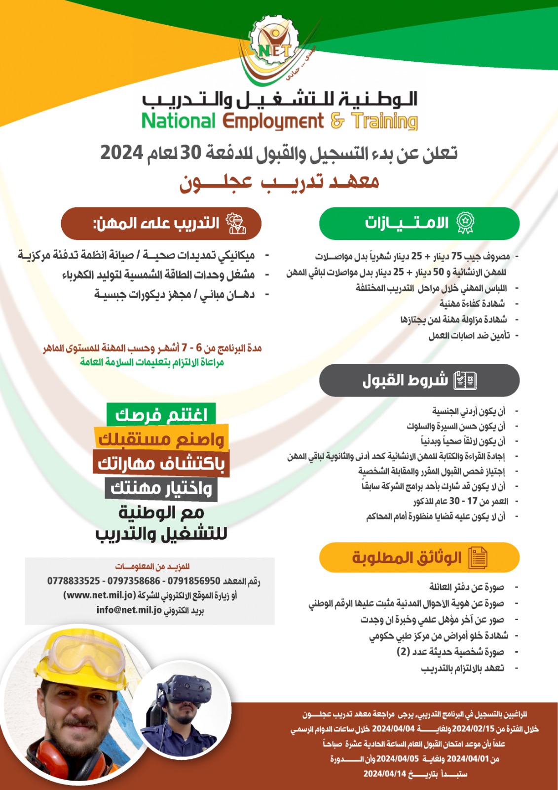 الشركة الوطنية للتشغيل – معهد تدريب عجلون يعلن عن بدء إستقبال طلبات الدفعة 30أخبار عجلونية في فبراير 26, 2024 =أكمل القراءة شارك