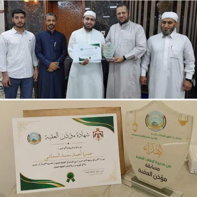 قام مدير اوقاف محافظة العقبة الشيخ فارس خلف الجـــــــــوازنة وبحضور رئيس قسم الموارد البشرية السيد ابراهيم الذنيبات والسيد ابراهيم النعامي من قسم المساجد في ليلة السابع والعشرين من رمضان بتكريم الفائز بالمركز الاول بمسابقة مؤذن العقبة الشيخ حمزة احمد المحاشي الذي يبلغ من العمر 25 عاما .