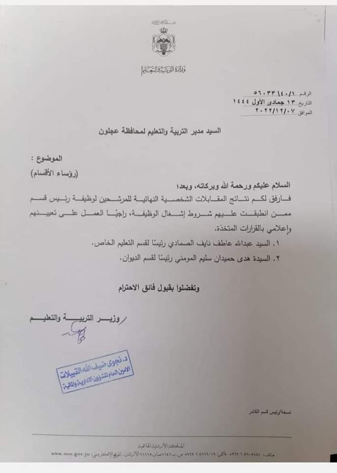 الصمادي رئيساً لقسم التعليم الخاص في مديرية تربية عجلون .