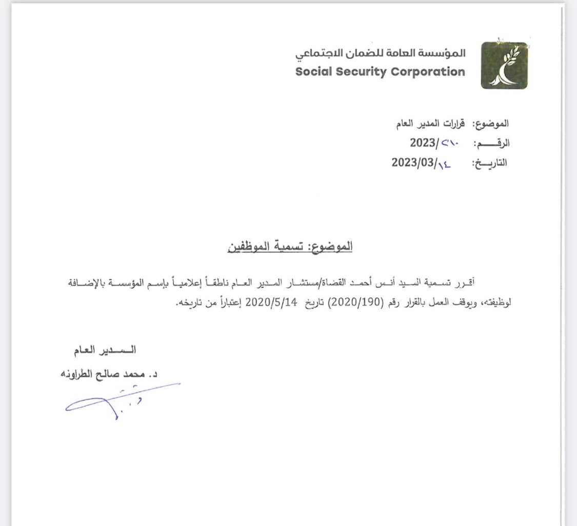 القضاه ناطقا إعلاميا بإسم مؤسسة الضمان الإجتماعي