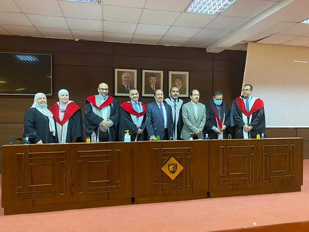وقد تشكلت لجنة المناقشة من الدكتور شادي ارشيد الصرايرة مشرفاً رئيساً والدكتور ليث أكرم القضاة مشرفاً مشاركاً والاستاذ الدكتور أحمد زكريا صيام مناقشاً داخلياً والدكتور وليد خلف الزعبي مناقشاً داخلياً والأستاذ الدكتور أسماء إبراهيم العمارنه مناقشاً خارجياً .