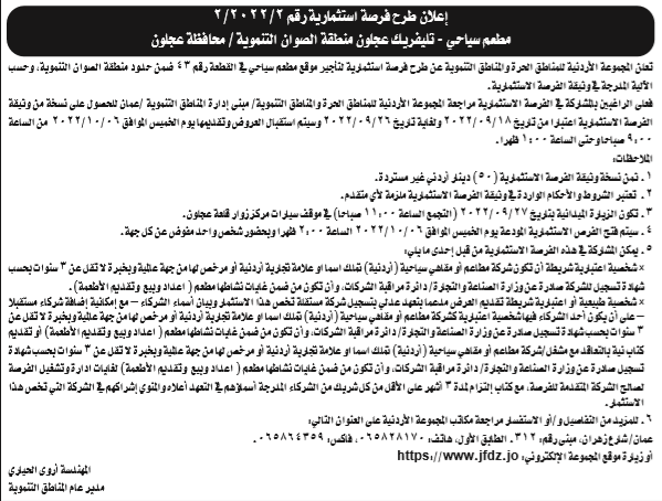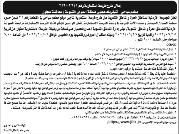 الحرة والتنموية تعلن فرصا استثمارية بمنطقة الصوان التنموية تلفريك عجلون