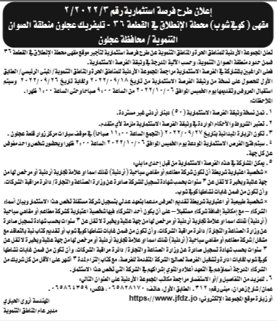 كما تشمل الفرص، تأجير مقهى (كوفي شوب)، في القطعة رقم 36 بمحطة الانطلاق، ومحلين تجاريين لغايات تجهيزهما وتشغيلهما وذلك في القطعتين رقم 43 و 36.