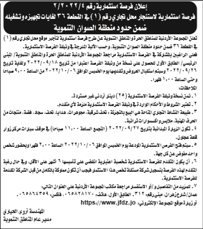 ودعت المجموعة الراغبين في الاستثمار إلى مراجعة مكاتب المبنى الرئيسي للمجموعة، الكائن بشارع زهران مبنى رقم 312 بعمان، للحصول على نسخ العطاء، وذلك اعتباراً من اليوم ولغاية 26 من الشهر الحالي، مشيرة إلى أنها ستستمر باستقبال العروض لغاية يوم 6 تشرين الاول القادم ، من الساعة التاسعة إلى الواحدة ظهرا.