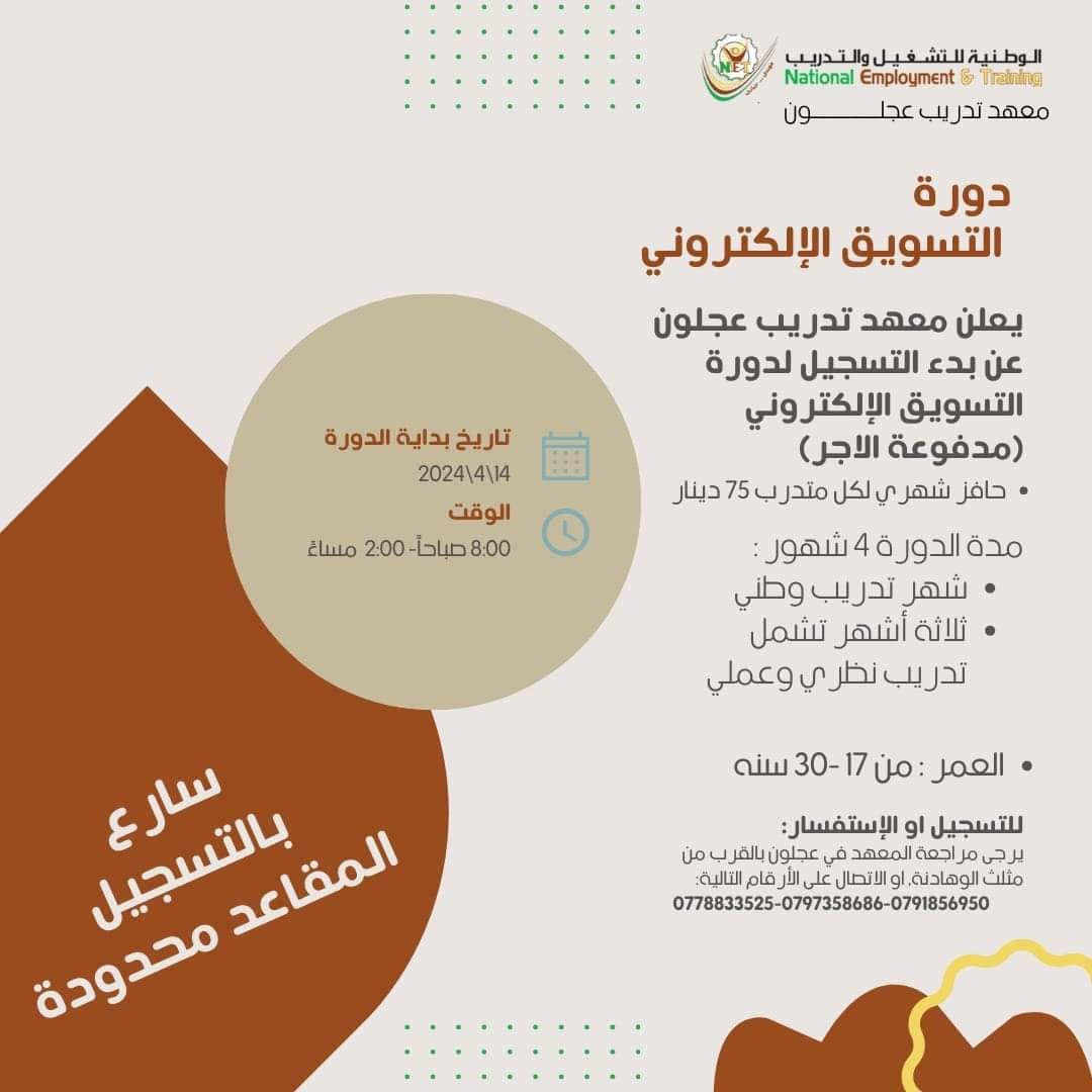 تنطلق يوم غد الأحد دورة التسويق الالكتروني التي يعقدها معهد الشركة الوطنية للتشغيل والتدريب في عجلون لأول مرة في المعهد مدفوعة الأجر .