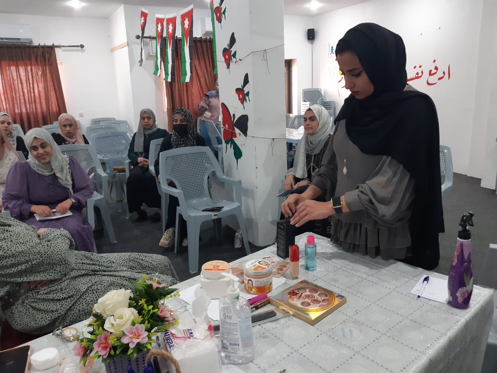 بدأت الكوافيرة خلود الدرابسه بتوضيح انواع البشرات وما يناسبها من المكياجات والكريمات ثم تنظيف البشره العميق ووضع الماسكات وكريمات السنفره المناسبة للمشاركات.