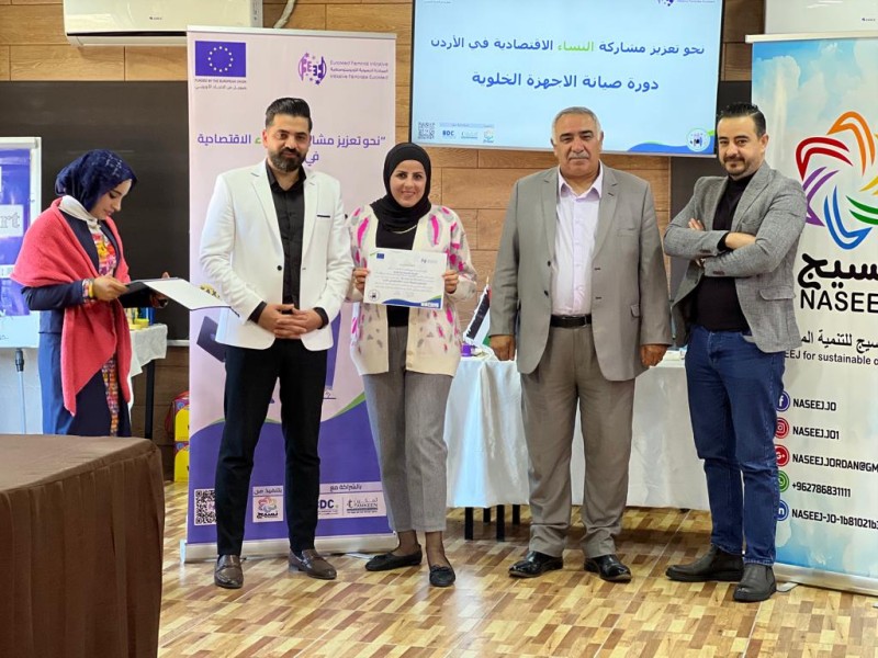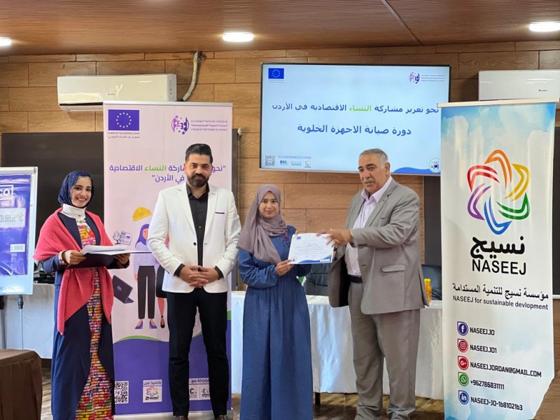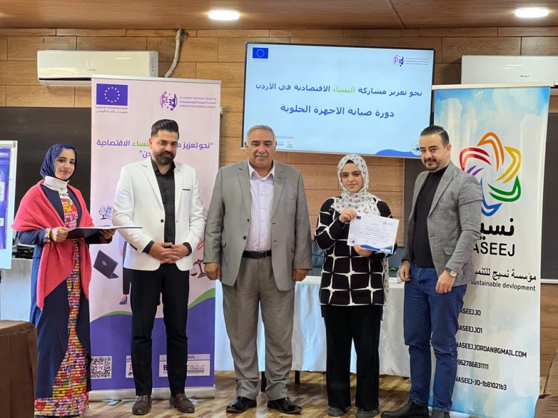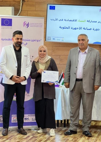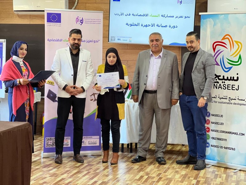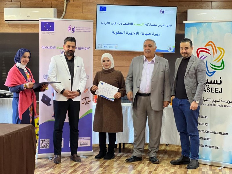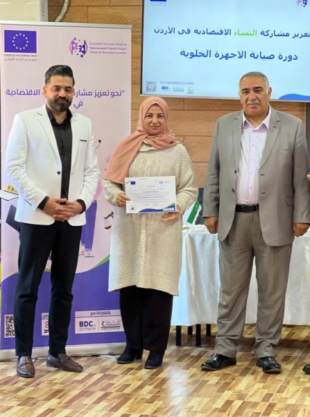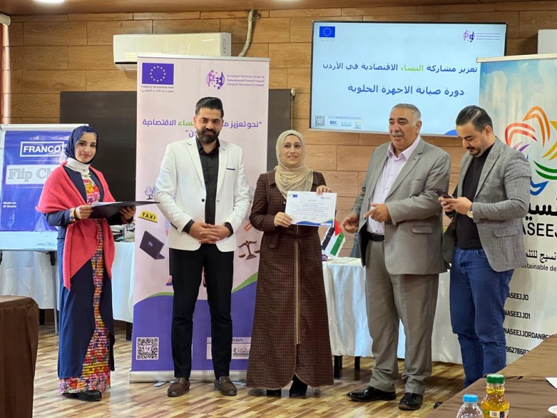 رعى رئيس مجلس محافظة عجلون عمر المومني حفل تخريج متدربات دورة “صيانة الأجهزة الخلويه ” حيث تم تخريج 20 سيدة من الجنسيه الأردنيه و السوريه بمجموع 50 ساعة تدريبية بشكل نظري وعملي لتعزيز مشاركة النساء وانخراطها ودمجها في سوق العمل وياتي هذا التدريب من ضمن إطار مشروع ” نحو تعزيز مشاركة النساء الأقتصاديه في الأردن ” المموّل من الأتحاد الأوروبي والذي ينفذه تحالف تقوده المبادرة النسوية الأورومتوسطيه وشركائها المحليين مركز تطوير الأعمال ومؤسسة تمكين للدعم والمساندة والذي ينفذه مؤسسة نسيج للتنمية المستدامة .