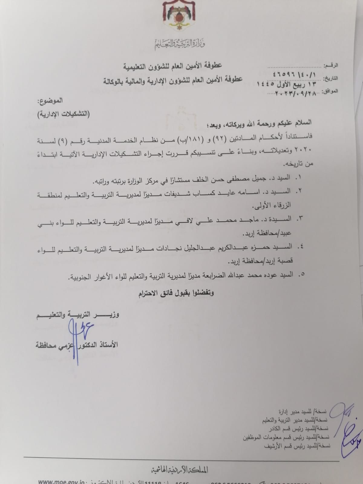 تشكيلات إدارة جديدة في وزارة التربية والتعليم ( أسماء )أخبار أردنية في سبتمبر 28, 2023 أكمل القراءة شارك