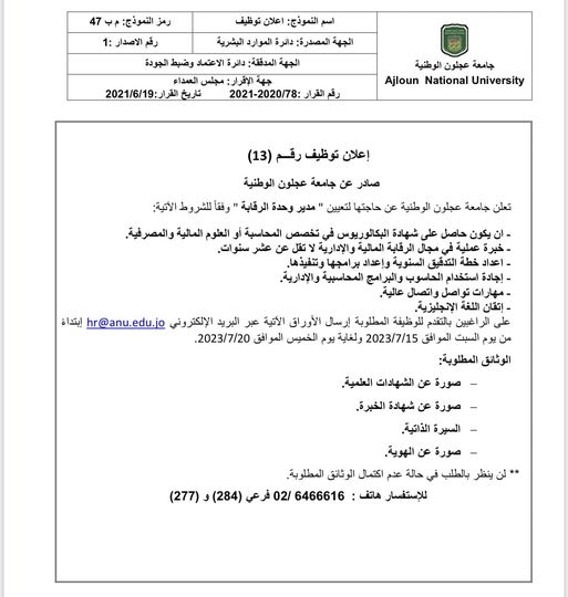 جامعة عجلون الوطنية تعلن حاجتها لتعيين “مدير وحدة الرقابة”أخبار جامعة عجلون الوطنيةأخبار عجلونية في يوليو 16, 2023 أكمل القراءة شارك