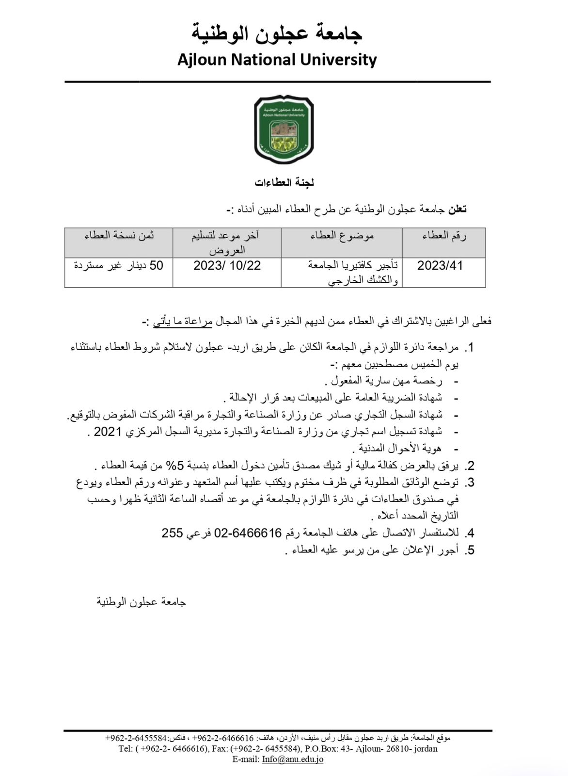 جامعة عجلون الوطنية تعلن عن طرح عطاء تأجير كافتيريا الجامعة والكشك الخارجيأخبار جامعة عجلون الوطنيةأخبار عجلونية في أكتوبر 9, 2023 –أكمل القراءة شارك