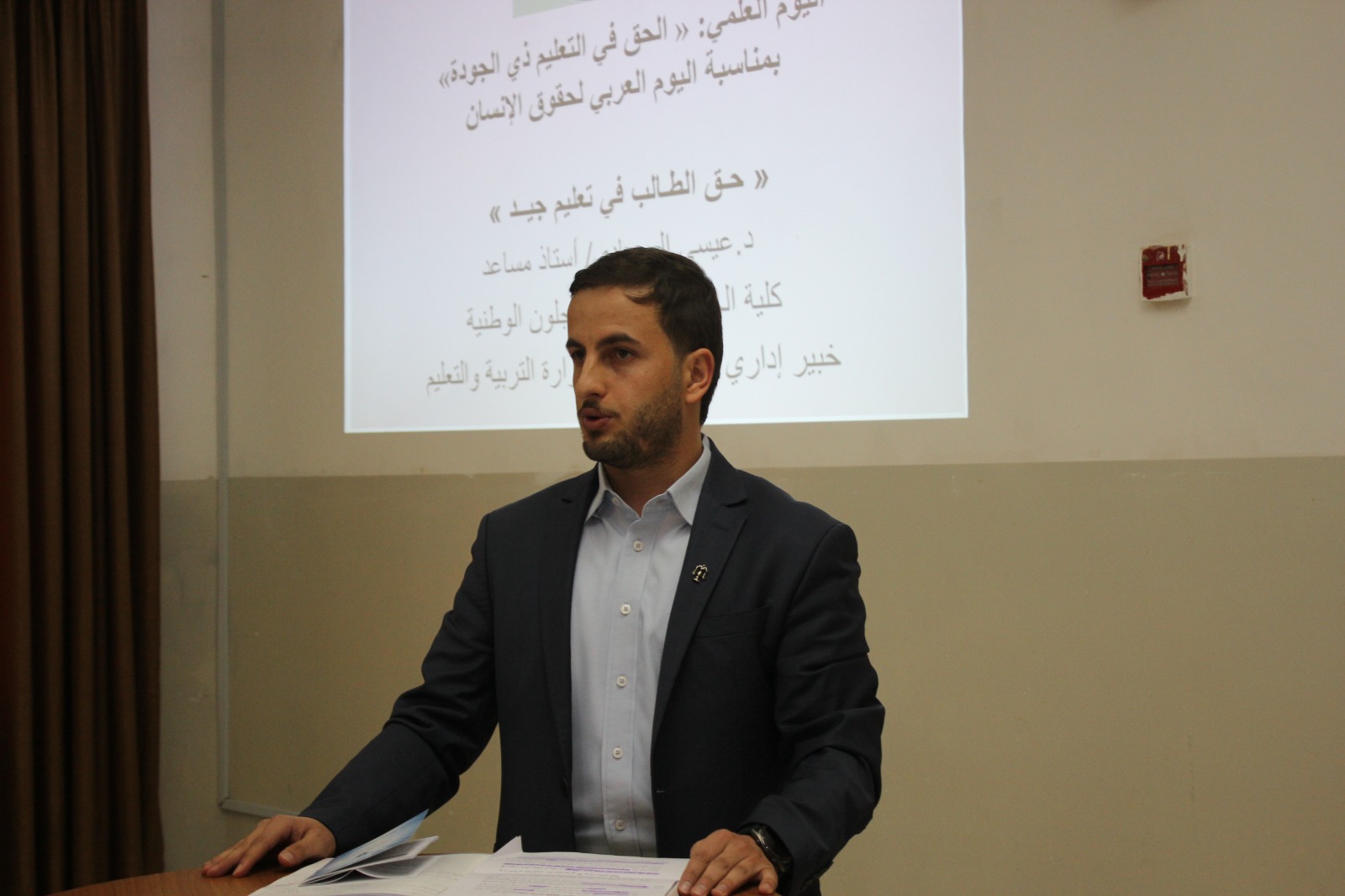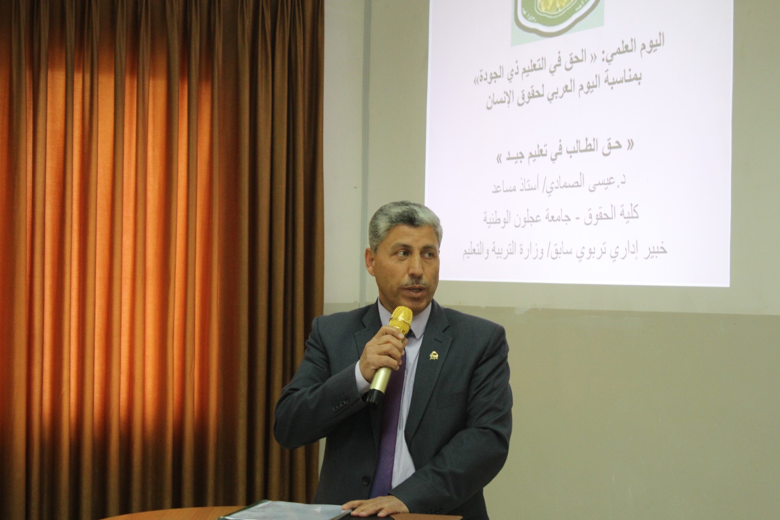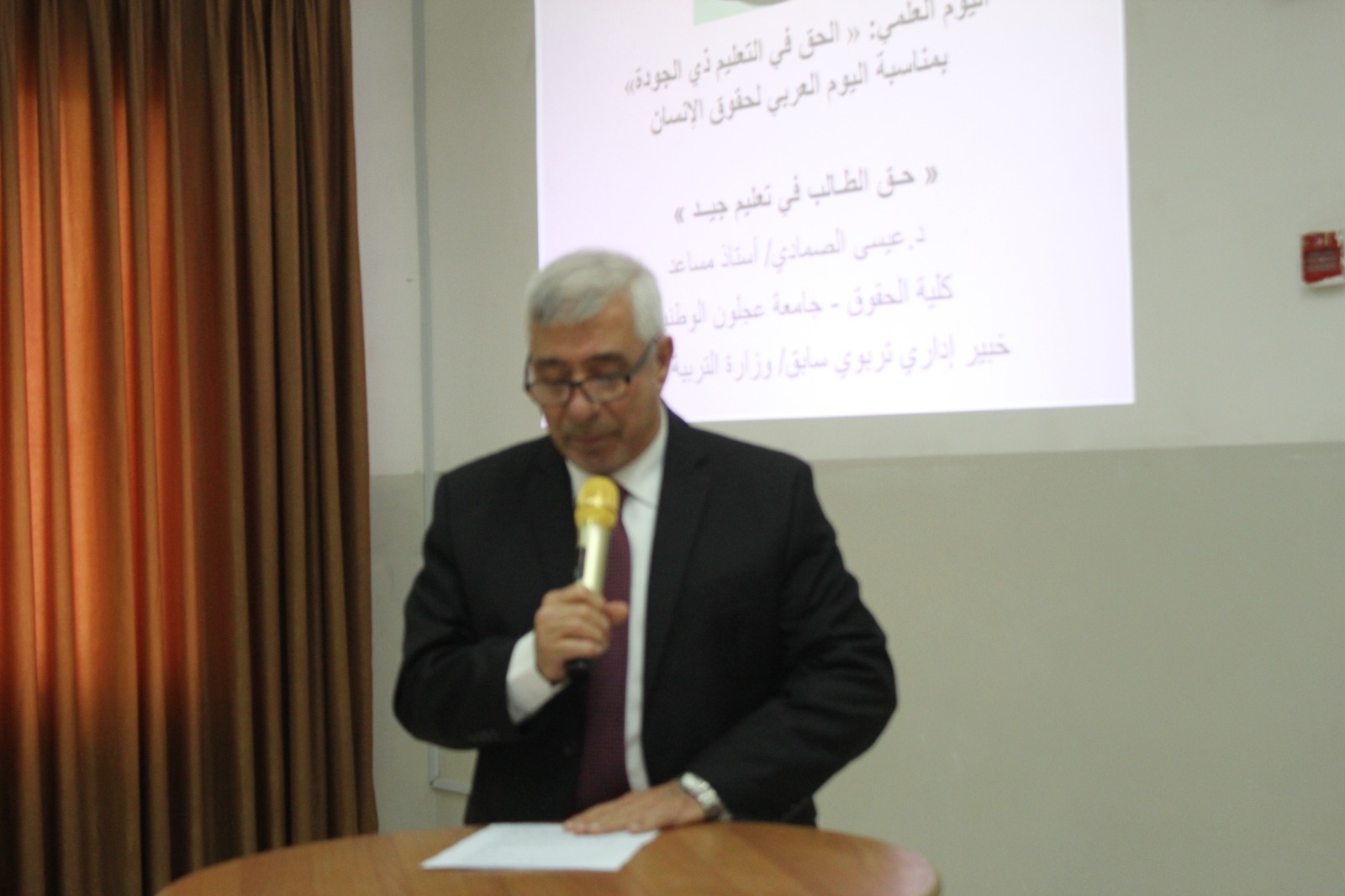 وقدم الدكتور عيسى الصمادي عرضاً يشرح فيه الميثاق العربي لحقوق الانسان وأبرز التشريعات الدولية لحقوق الانسان