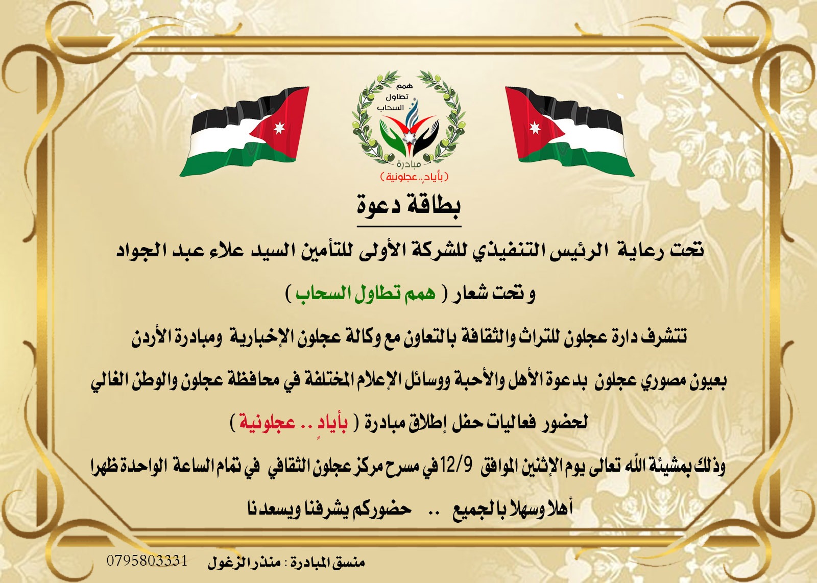 دعوة عامة للأهل والأحبة في محافظة عجلون والوطن الغالي لحضور حفل إطلاق أكبر مبادرة على مستوى المحافظة والوطن
