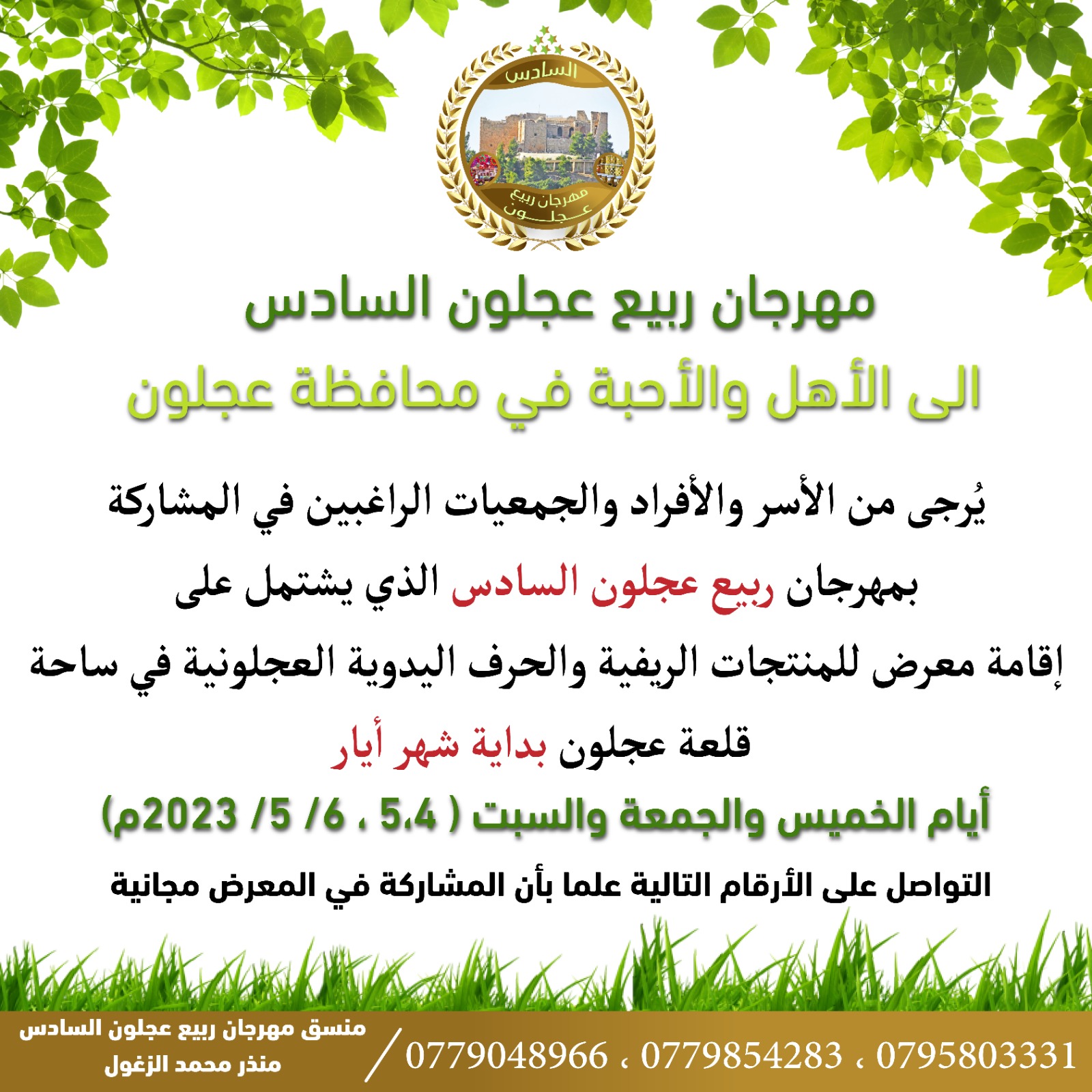 يسر الجهات المنظمة لمهرجان ربيع عجلون السادس الذي يتضمن إقامة معرض للمنتجات الريفية والحرف اليدوية العجلونية أن تدعو الأسر والجمعيات والأفراد العاملين في هذا المجال الى المشاركة  في المهرجان الذي سيقام بداية الشهر القادم بساحة قلعة عجلون ، علما بأن المشاركة في المهرجان  مجانية ولا يترتب على المشاركين أي مقابل مادي ،حيث ستتحمل الجهات المنظمة كافة تكاليف المهرجان .