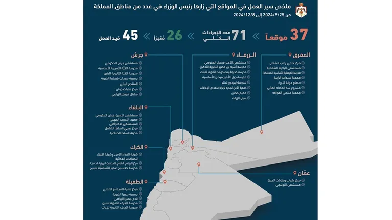 نشرت رئاسة الوزراء اليوم السبت، التقرير الدوري الثاني عن سير العمل في المواقع التي زارها رئيس الوزراء الدكتور جعفر حسَّان في عدد من مناطق المملكة، ضمن جولاته الميدانيَّة الأسبوعيَّة.