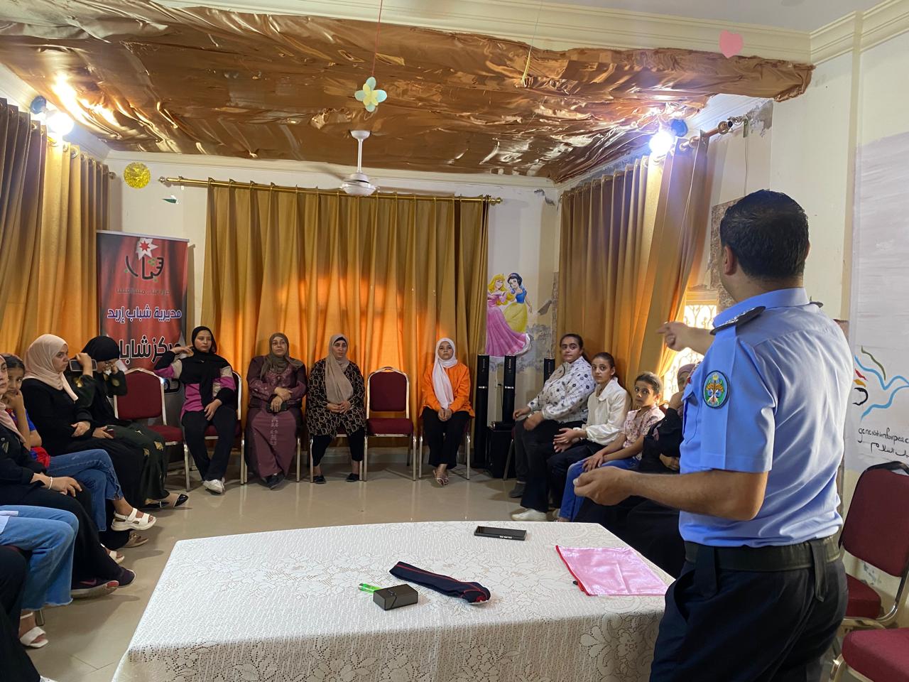 ونفذ في مركز شابات المزار الشمالي محاضرة توعوية بعنوان الصحة و السلامة المهنية بالتعاون مع الشرطة المجتمعية ومرتبات الدفاع المدني بلواء المزار الشمالي ، وبحضور 20 من من المشاركات ضمن الفئة العمرية 18-24 عام .