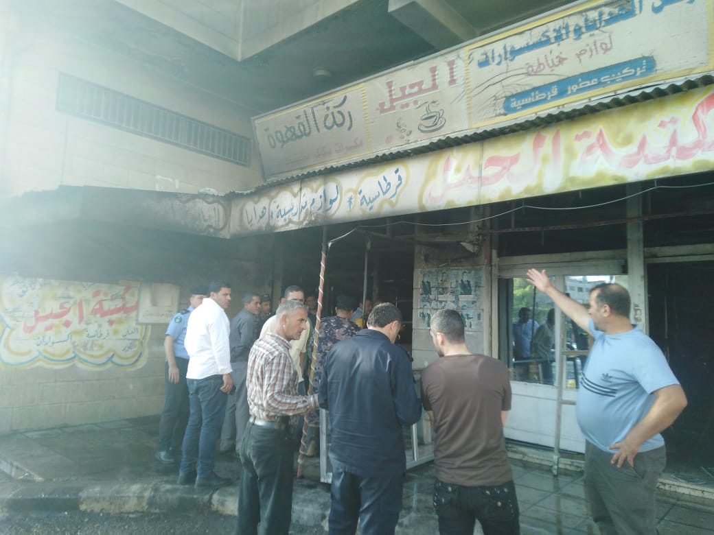فقد أتت النيران على مكتبة الجيل ومحتوياتها بصورة كاملة وقد تواجد في الموقع مدير الشرطة العقيد وصفي العزام الذي اشرف على التعامل مع الحريق ومتابعة عمليات الاطفاء من قبل كوادر الدفاع المدني .
