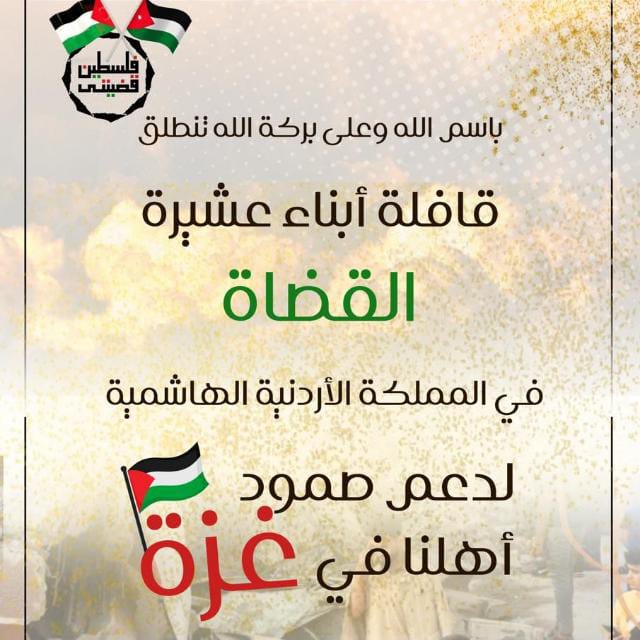 إستجابة للدور الأردني بقيادة جلال الملك حفظة الله في دعم صمود الأهل في غزة ، وتـاسيا بكافة عشائر ومؤسسات المملكة ، تشكلت لجنة من عشيرة القضاه في محافظ عجلون ، حيث أطلقت مبادرة مساء الخميس الثالث من نيسان تحت عنوان ” قافلة أبناء عشيرة القضاه في المملكة الاردنية الهاشمية لدعم صمود أهلنا قي غزة” من خلال جمع التبرعات النقدية والعينية لإغاثة أشقائنا في قطاع غزة والتي ندعوا الله سبحانه وتعالي ان يفرجها عليهم بالقريب العاجل إن شاء الله