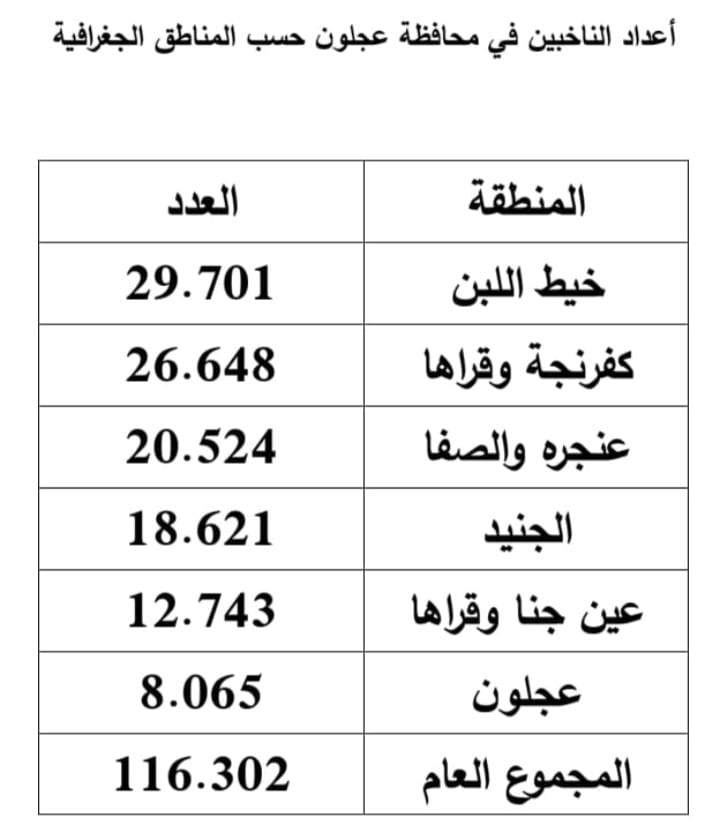 كما يذكر أن   رئيس لجنة إنتخاب عجلون  هاشم أبو أحمده أكد في تصريحات سابقة  لعجلون الاخبارية  أن عدد أصوات الناخبين في محافظةعجلون بلغ  قرابة 116302ناخبا منها 64156 ناخبه و52146 ناخب،وفقا للكشوفات الأولية الصادرة عن الهيئة المستقلة للانتخاب.