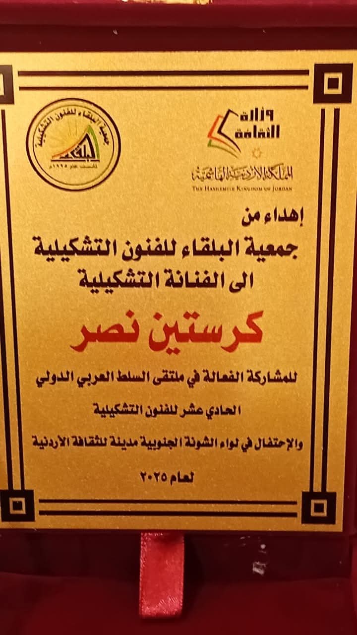 شاركت الكاتبة والفنانة التشكيلية والمهندسة المعمارية كريستين حنا نصر في معرض دولي للفن التشكيلي في الاردن ، حيث جرى تحت رعاية عطوفة محافظ البلقاء الاستاذ فيصل المساعيد اقامة معرض ملتقى السلط العربي و الدولي للفنون التشكيلية يوم السبت بتاريخ 27 ايلول 2025م ، وقد شاركت فيه المهندسة المعمارية و الكاتبة كريستين نصر كفنانة تشكيلية تحمل موهبتها معها في هذا المجال برفقة مجموعة مميزة من فنانين الاردن وعدد من دول الوطن العربي بهدف زيادة اواصر التشارك العربي وتفعيل الحضور الجماعي اضافة الى حمل رسالة هذا الفن الانساني المعبر عن قيم الانسانية وتطلعاتها نحو الجمال والسلام والمحبة في هذا الوقت العصيب الذي يشهد صراعات وازمات يجب على الفنان التفاعل معها معبرا عن هموم وتطلعات الناس ، وجاءت المشاركة ضمن فعاليات تدعم الوطن وتنشط السياحة وتدعم المجتمع المحلي فكانت رمزية مشاركتها رسالة حب للفن والوطن .