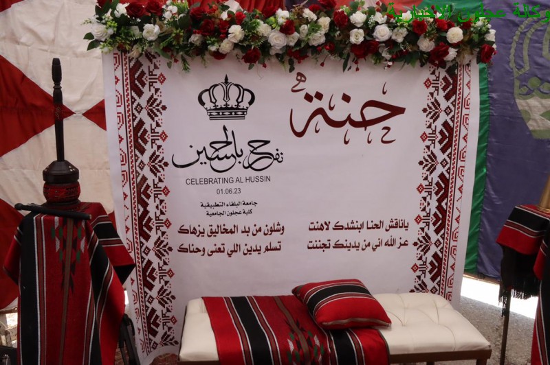 تنفيذا لتوجيهات رئيس جامعة البلقاء التطبيقية ومندوبا عن رئيس جامعة البلقاء الّتطبيقيّة الأستاذ الدكتور أحمد فخري العجلوني رعى الأستاذ الدكتور وائل الربضي عميد كلية عجلون الجامعيّة الاحتفال بمراسم حناء سمو ولي العهد الأمير حسين بن عبداللّه الذي أقامته كلّيّة عجلون الجامعيّة/ جامعة البلقاء الّتطبيقيّة بحضور نائب العميد ومساعدوا العميد و أعضاء الهيئتين التدريسيّة و الاداريّة و طلبة كلّيّة عجلون.