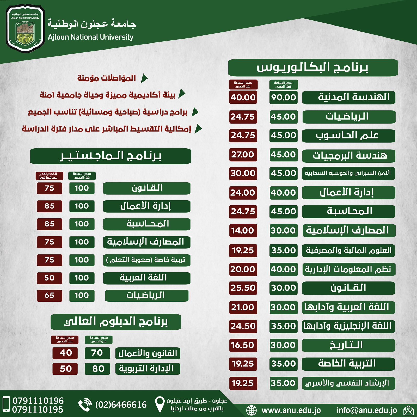 أقر مجلس أمناء جامعة عجلون الوطنية في جلسته التي عقدها اليوم السبت الموافق 2023/2/4 برئاسة الدكتور محمد نور الصمادي رئيس المجلس وبحضور أعضاء المجلس ورئيس الجامعة الأستاذ الدكتور فراس الهناندة اجراء خصومات على رسوم الساعات المعتمدة لتخصصات البكالوريوس في الهندسة المدنية والأمن السيبراني والحوسبة السحابية والمصارف الاسلامية والدبلوم العالي في القانون والأعمال وماجستير اللغة العربية .
