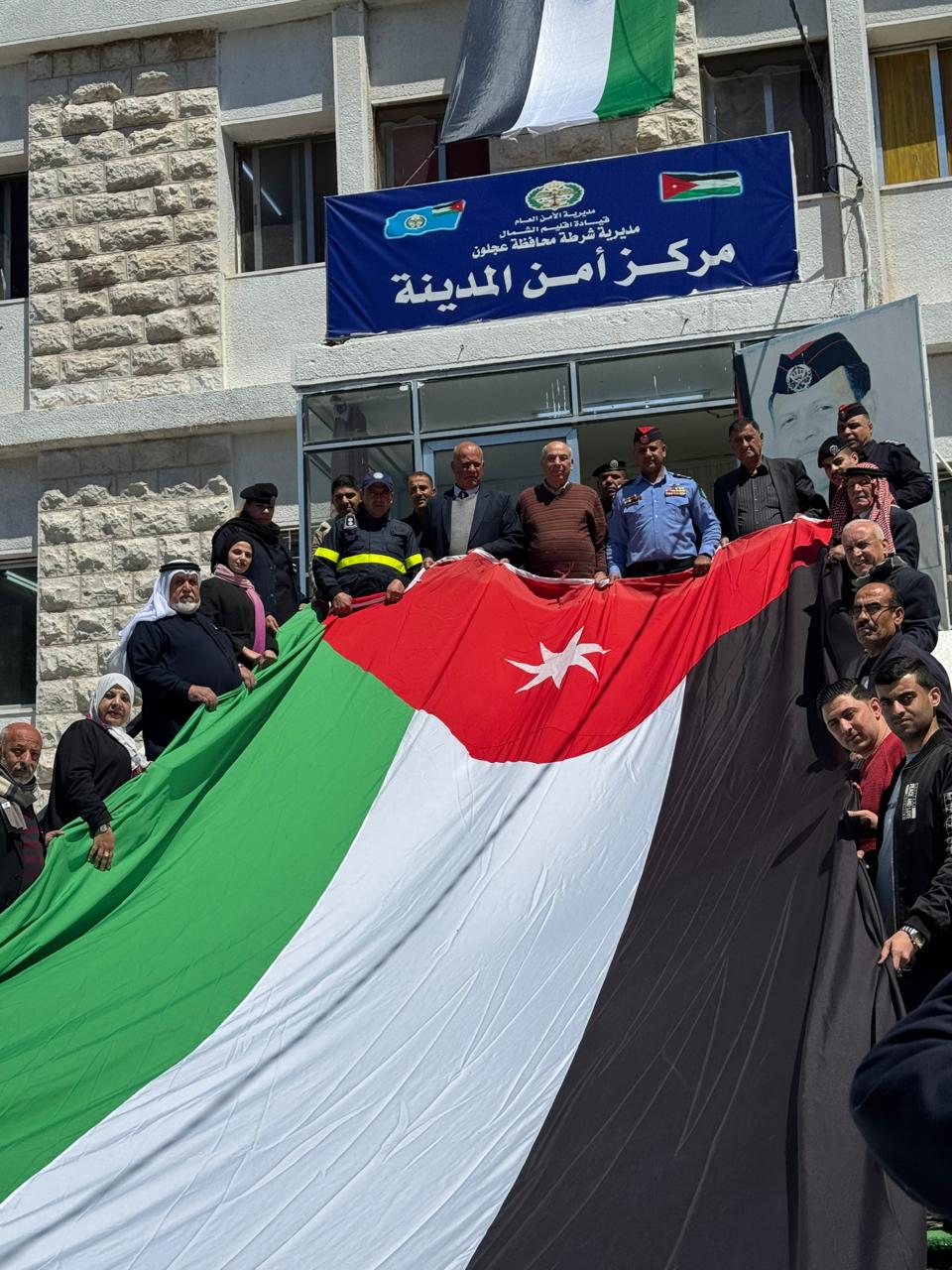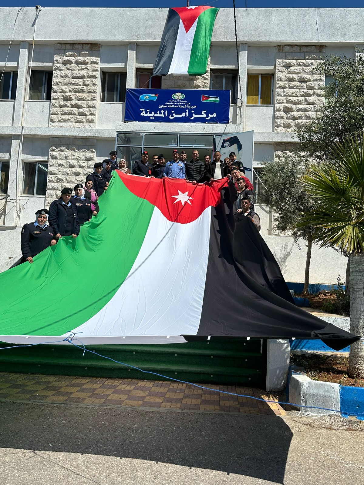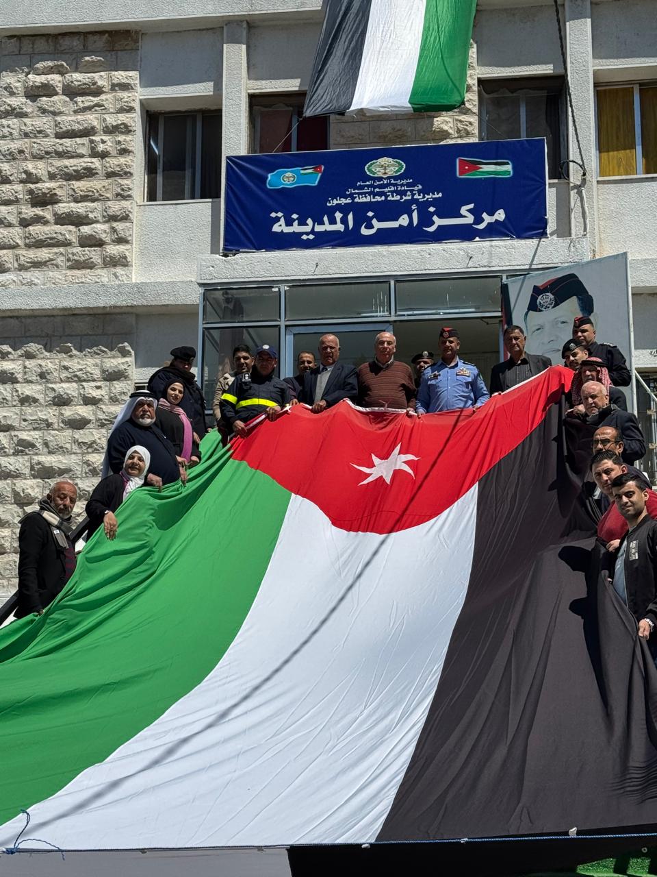 تزين المركز الامني في مدينة عجلون بالعلم الاردني بطول ٩ امتار من قبل مرتبات المركز الامني والمجلس المحلي بمناسبه يوم العلم الاردني الذي يصادف يوم غدا الأربعاء بحضور رئيس مركز أمن المدينه عجلون المقدم قاسم حرادان