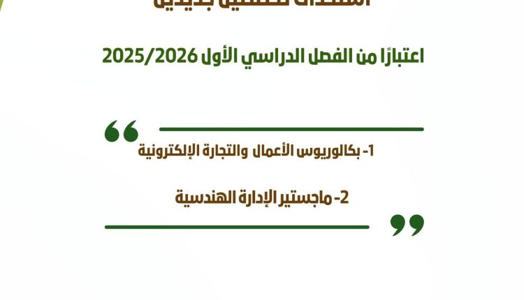 ويأتي استحداث هذين التخصصين استجابة لاحتياجات سوق العمل المحلي والإقليمي، حيث يوفّر برنامج بكالوريوس الأعمال والتجارة الإلكترونية مسارًا أكاديميًا متطورًا يمكّن الطلبة من اكتساب المهارات اللازمة في مجالات التجارة الرقمية، والتسويق الإلكتروني، وإدارة الأعمال ضمن بيئة رقمية متقدمة، بما يعزز قدرتهم على المنافسة في الاقتصاد الرقمي المتسارع.