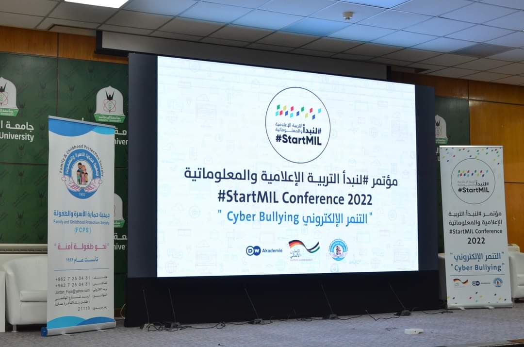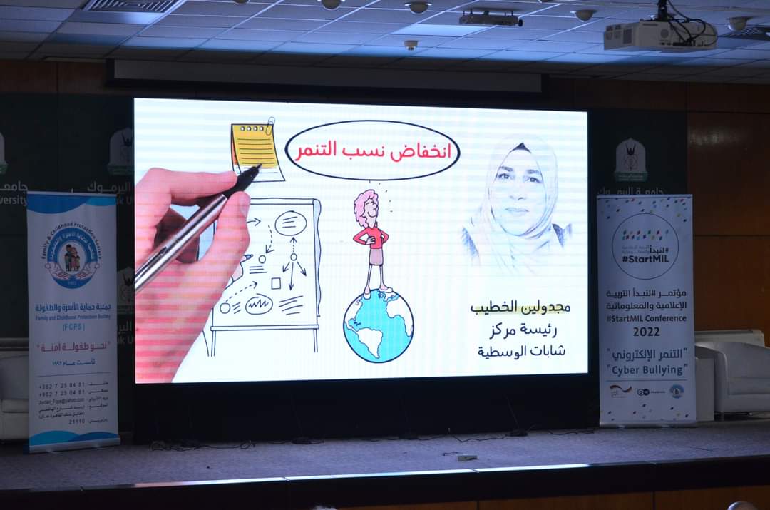 مشاركة وحضور جميع رؤساء المراكز الشبابية في محافظة إربد فعاليات مؤتمر “لنبدأ التربية الإعلامية والمعلوماتية” الذي تنظمه جمعية حماية الأسرة والطفولة، بالتعاون مع أكاديمية دوتشيه فيله الألمانية في رحاب جامعة اليرموك لمدة يوميين متواصلة الفعالية ، وذلك بعنوان” التنمر الإلكتروني وآثاره على المجتمع.”