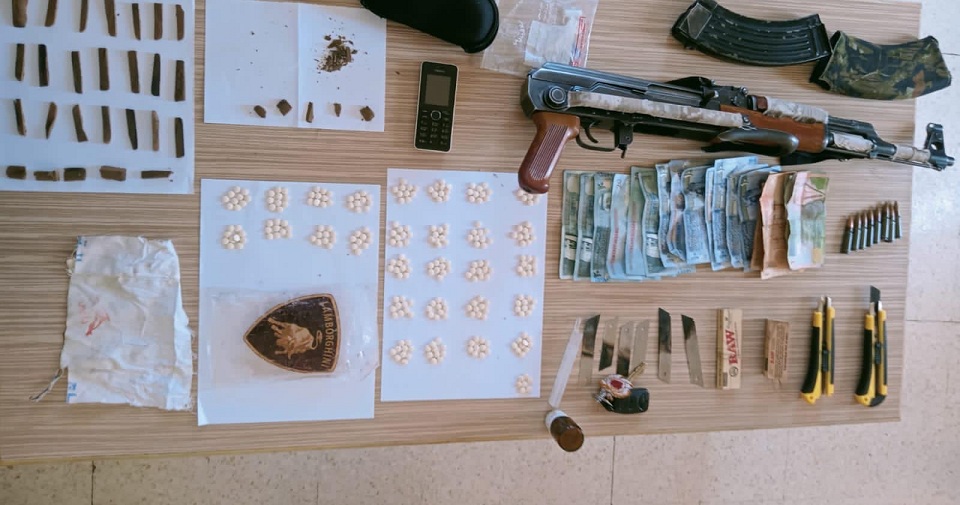 وفي إحدى مناطق البادية الجنوبية دوهم احد مروجي المواد المخدرة بعد أن تم التأكد من حيازته لكميات متفرقة منها لأغراض الترويج والبيع وعند مداهمته ابدى مقاومة شديدة للقوة، إلا انه تمت السيطرة عليه وضبطه وضبط ما بحوزته من مخدرات وسلاح ناري