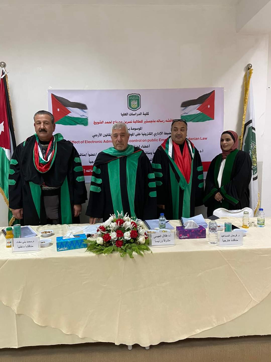 اما الثانية فكانت للطالبة : نسرين مصباح الشويخ وعنوان رسالتها “أثر الضبط الإداري إلكترونياً على الموظف العام في القانون الأردني ”