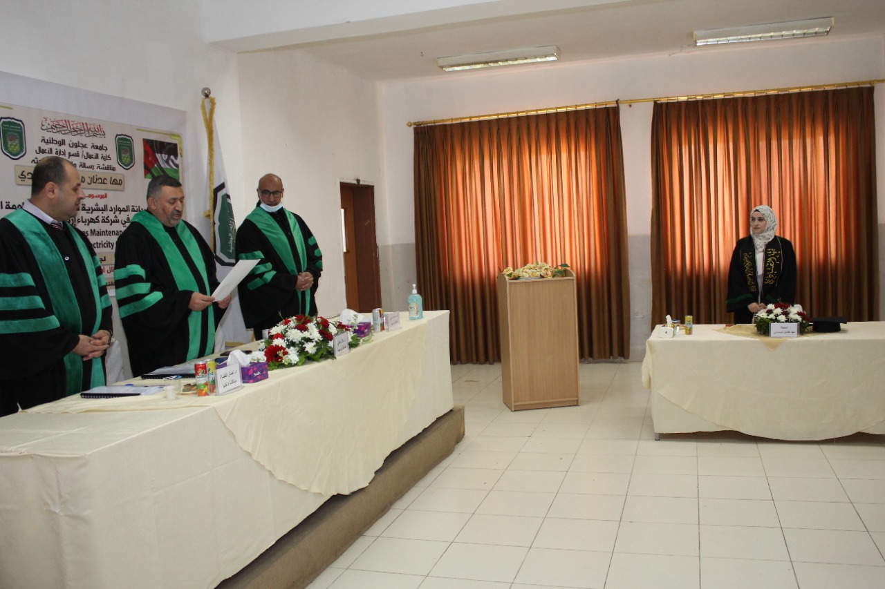 الاولى وكانت للطالبة : مها عدنان الصمادي وعنوان رسالتها “دور صيانة الموارد البشرية في الحد من مقاومة التغيير في شركة كهرباء اربد في الاردن ”