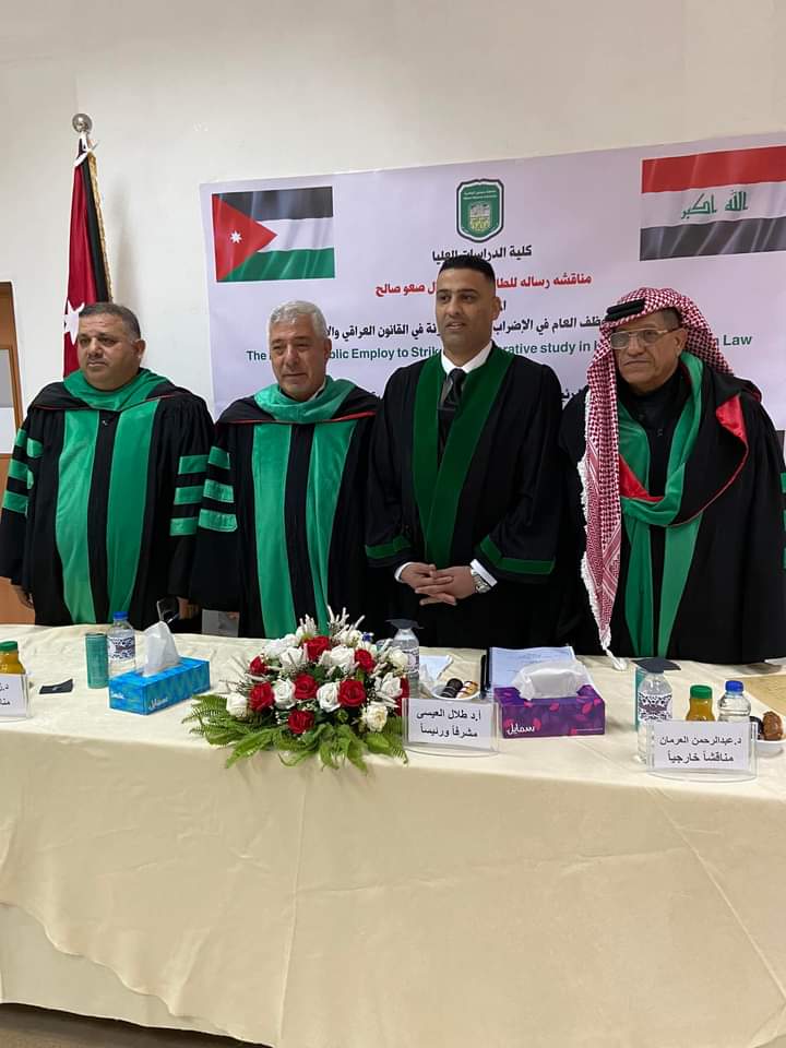 الاولى وكانت للطالب : سيف غزال صعو صالح وعنوان رسالتة “حق الموظف العام في الإضراب دراسة مقارنة في القانون العراقي والأردني”