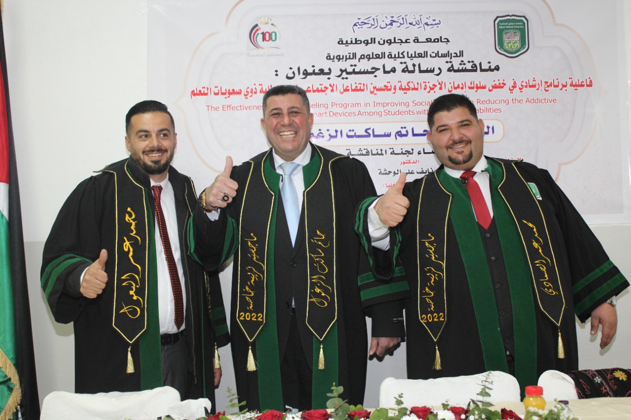 والرابعة فكانت للطالب : حاتم ساكت حسين الزغول / قسم صعوبات التعلم وعنوان رسالتة : ” فاعلية برنامج ارشادي في خفض سلوك إدمان الأجهزة الذكية وتحسين التفاعل الاجتماعي لدى الطلبة ذوي صعوبات التعلم ”