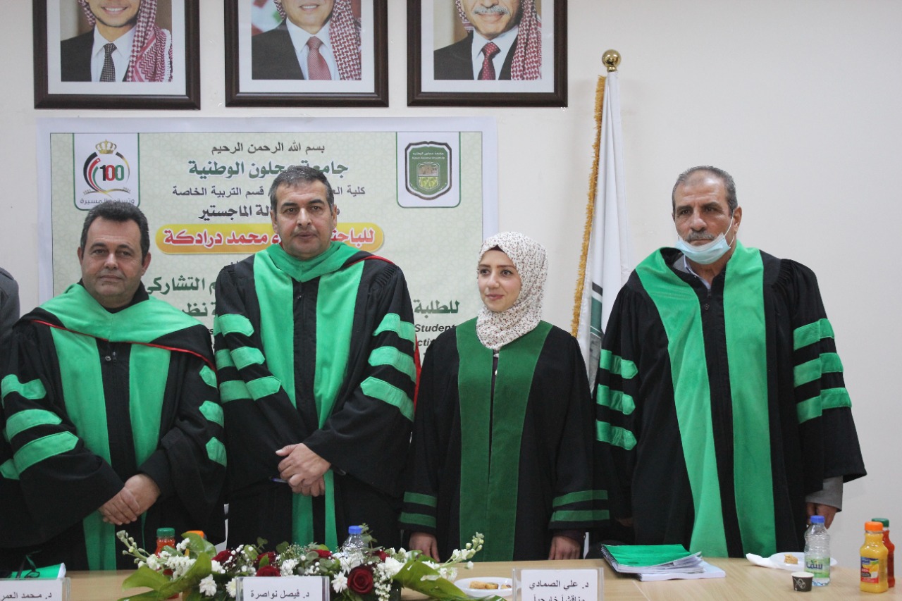 والسادسة فكانت للطالبة : إ سراء محمد درادكة / قسم صعوبات التعلم وعنوان رسالتها : اتجاهات المعلمين نحو التعليم التشاركي للطلبة ذوي صعوبات التعلم من وجهة نظر مدراء المدارس