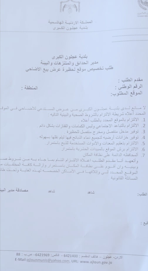 ▪لماذا خلا طلب التخصيص من الشرط الوارد في تعميم وزارة الإدارة المحلية بخصوص مواقع بيع الأضاحي والذي ينص على أن الموقع يجب أن يكون خارج حدود التنظيم، وبعيد عن السكان والشوارع الرئيسية والأماكن الحساسة كالمساجد والمدارس والمستشفيات؟!