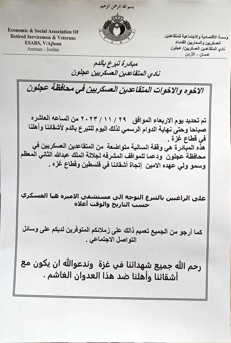 نادي المتقاعدين العسكريين- عجلون ينظم حملة للتبرع بالدم للأشقاء في قطاع غزة