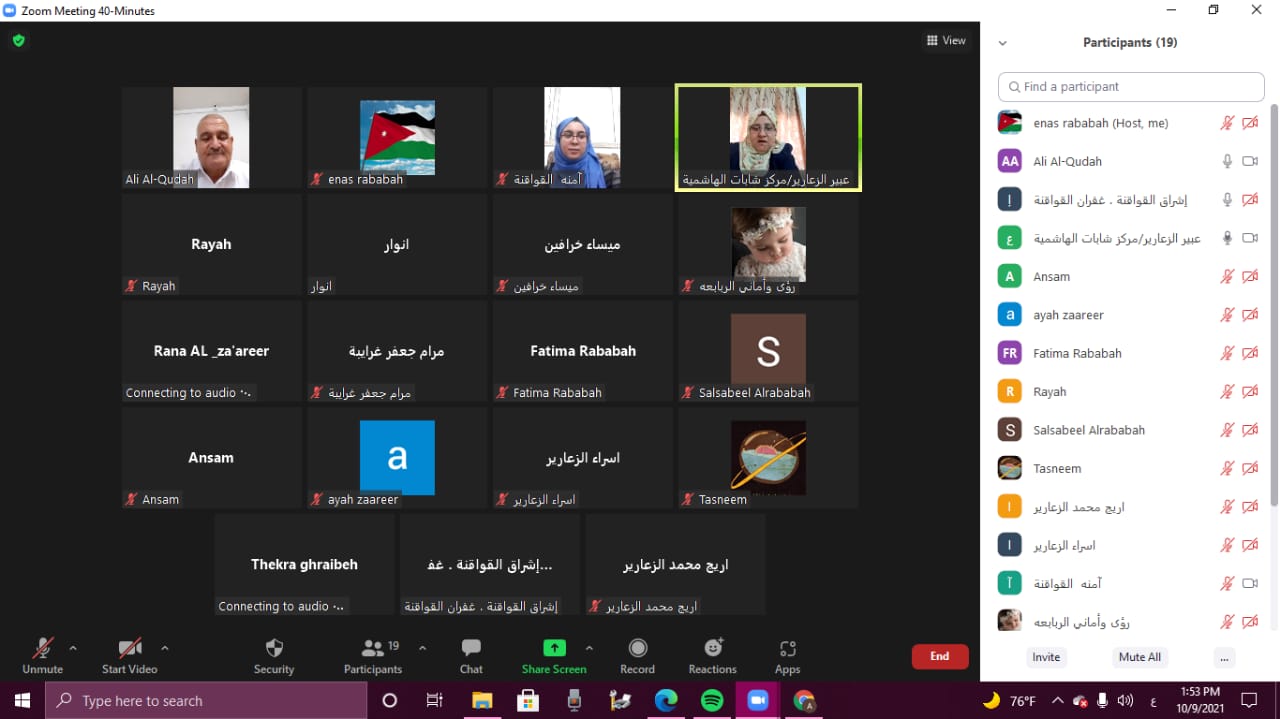 نفذ مركز شابات الهاشمية ورشة عمل بعنوان “دور الشباب في صنع القرار” بمشاركة 20 شابة عبر تطبيق زووم