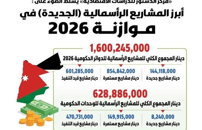 – «مركز الدستور للدراسات الاقتصادية» يستعرض، أبرز المشاريع الراسمالية (الجديدة) للدوائر الحكومية في مشروع الموازنة والتي تقدر بنحو ( 144,118,000 دينار) مقابل (854,842,000) دينار / مشاريع مستمرة ، و(601,285,000 )دينار / مشاريع قيد التنفيذ.