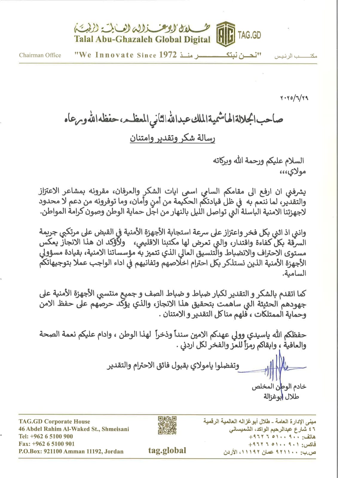 عمّان – وجّه سعادة الدكتور طلال أبوغزاله، رئيس ومؤسس مجموعة طلال أبوغزاله العالمية، رسالة شكر وامتنان إلى جلالة الملك عبد الله الثاني ابن الحسين، مشيدًا بقيادته الحكيمة التي جعلت من الأردن نموذجًا في الأمن والاستقرار على مستوى المنطقة العربية.