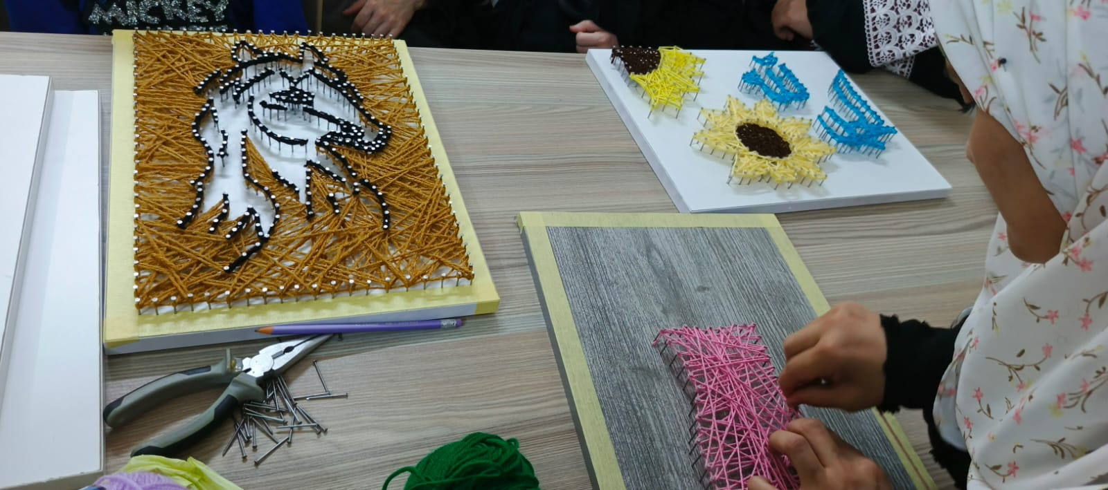 تحدثت خلالها المدربة آلاء الفقيه، عن الأسس الأولية والأدوات المطلوبة، مثل اللوحات الخشبية، والمسامير، والخيوط المناسبة لإنتاج لوحات فنية جمالية.